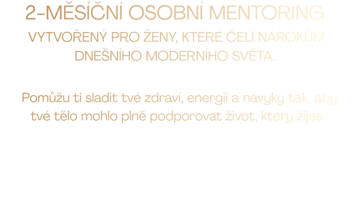 Po dobu následujících dvou měsíců zůstáváme v pravidelném kontaktu. Můžeš se na mě obracet s otázkami i sdílet své postřehy a podle toho plán průběžně upravujeme tak, jak na něj tvé tělo reaguje. Tento prostor je tu proto, aby podpořil tvou důslednost, přinesl větší jasnost a umožnil klidný, postupný posun, díky němuž se tvé zdraví může přirozeně rozvíjet společně s tvým podnikáním.